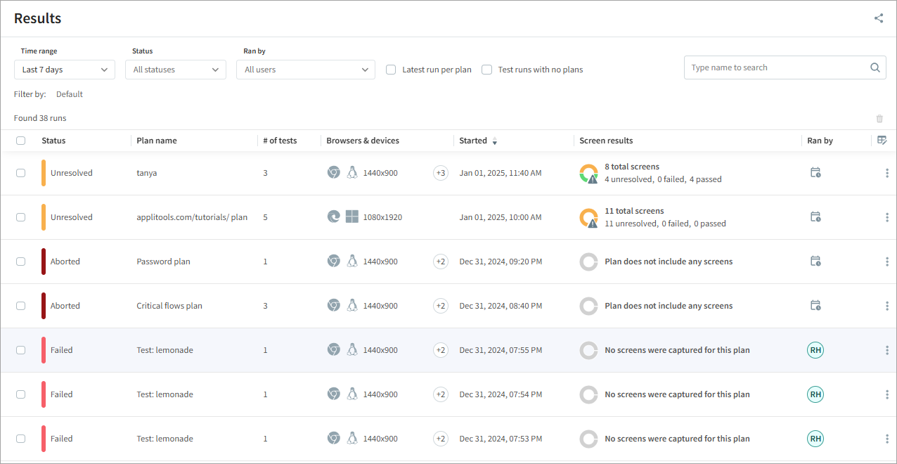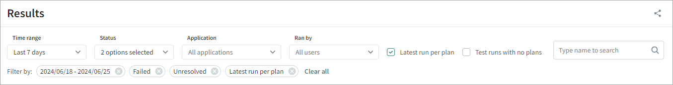At the top of the page, you can filter the results by time range, status, application, and user. You can also limit the output to show only the latest run in each plan.
