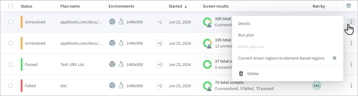 - Convert drawn regions to element-based regions - Convert regions in all tests in the plan to element-based regions. For details, see Updating Drawn Regions to DOM Elements.