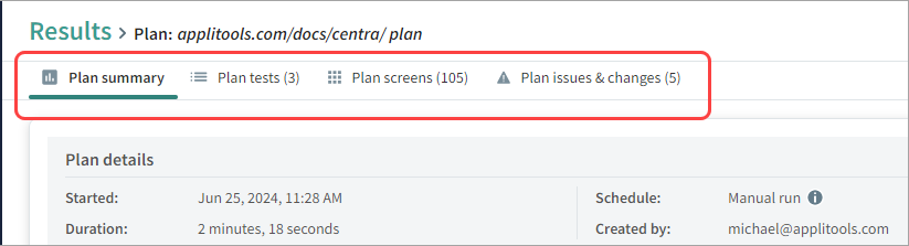 - Plan Issues & Changes – Lists added and removed screens, errors, and diffs found in all tests in the plan. For details, see Issues & Changes View.