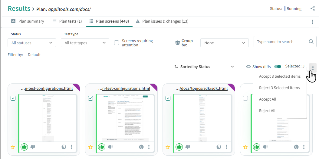 – Accept – Changes the status of the screen to Accepted. This means that differences are expected or do not represent a bug and the changed screen will be used as the baseline the next time that the test runs.