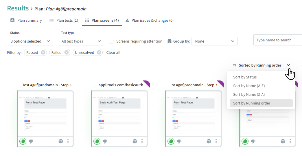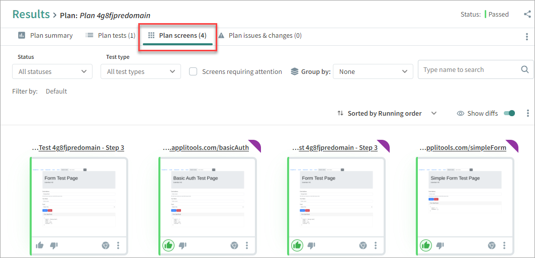 The Screens view in the Results page shows a thumbnail of all screens in all tests in a plan or a specific test. This is an easy way to get a visual overview of the entire plan without needing to open each screen individually. New screens have a purple icon in the top left corner.