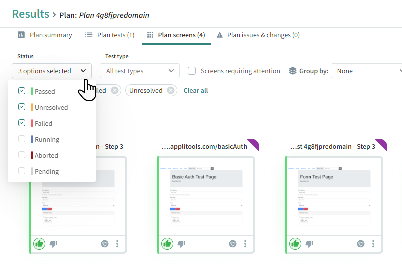 Grouping tests makes it easy to compare similar tests. For example, by grouping by viewport, you can see all screens in the same viewport side-by-side, making it easy to spot any screens that do not load correctly in a specific viewport. You can group the results by any of the following: