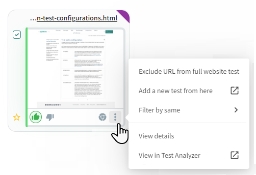 - Exclude URL from full website test (Available in Full Website Test only) – Adds the screen to the list of excluded URLs so that it will not be included in future tests. If you need to add the test again, see Excluding or Adding URLs.