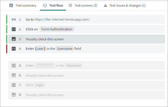 If a step failed, a red bar is displayed at the step that failed, and no further steps are processed.