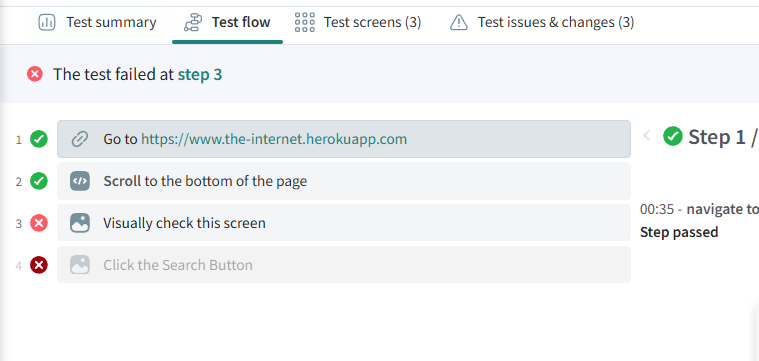 - Clicking the failure summary at the top of the Test Flow view navigates directly to the failed step.