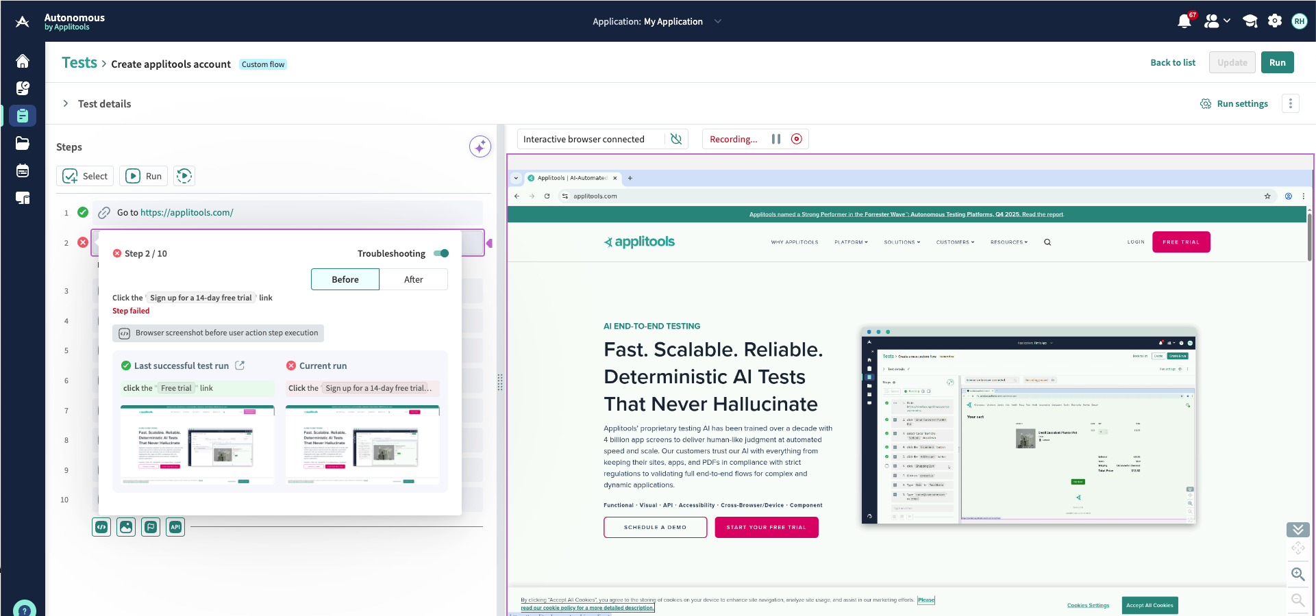 - You can manually enable the Troubleshooting toggle for any step while authoring a test.