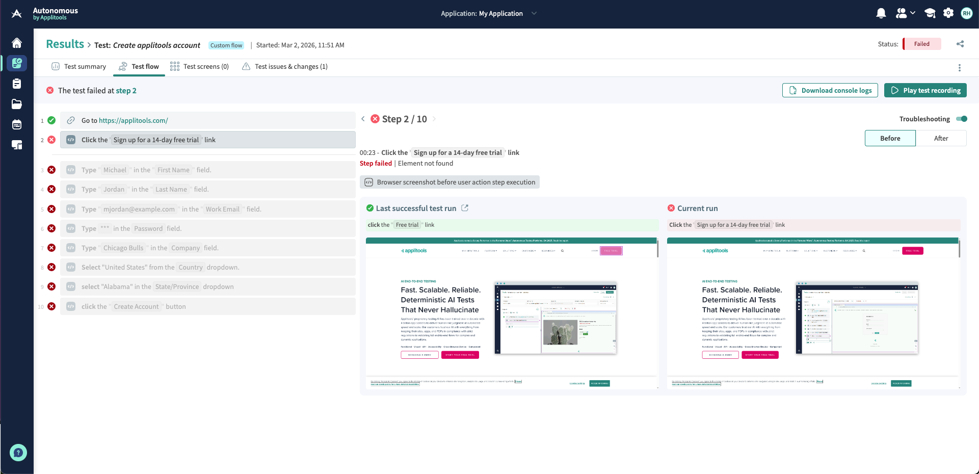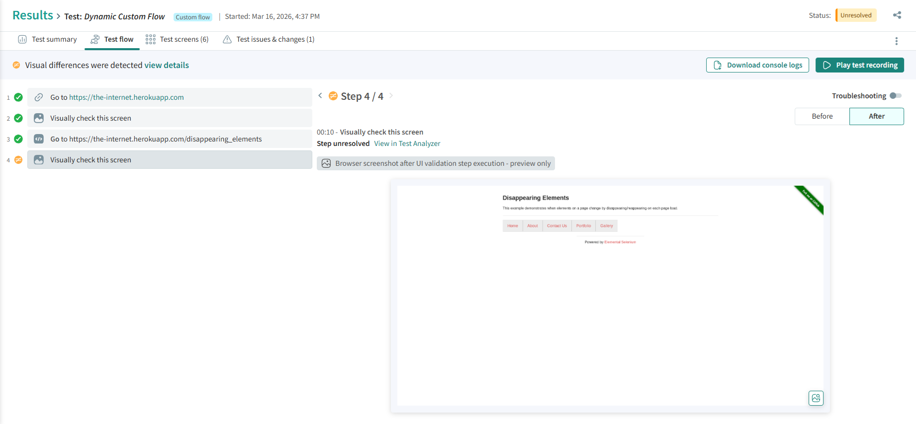 When a Custom Flow test step fails, you can use Troubleshooting mode from the Test Flow view in the Results page or while reviewing step results during test authoring to compare the current run with the last successful run and understand the cause of the failure.