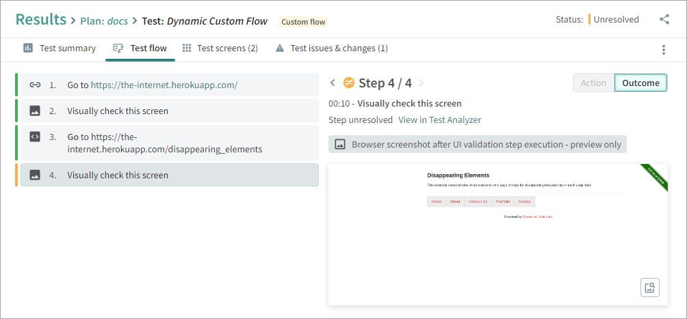 The Test Flow view displays details of a custom flow test. This view is only available for custom flow tests; it is not available at the plan level. The view shows all the steps in the custom flow test with an image of the website or application at each stage.