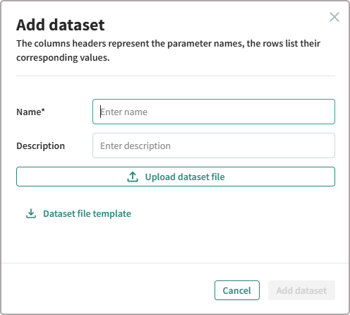 If you haven't created a dataset file yet, click Dataset file template to download a sample CSV file. Modify this file by adding the required parameter names and values.