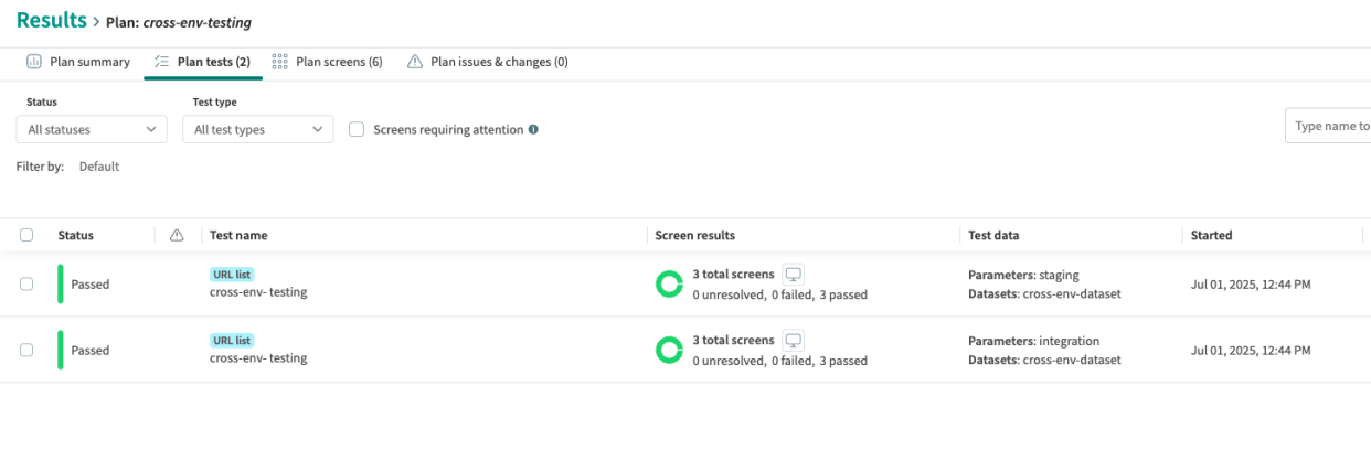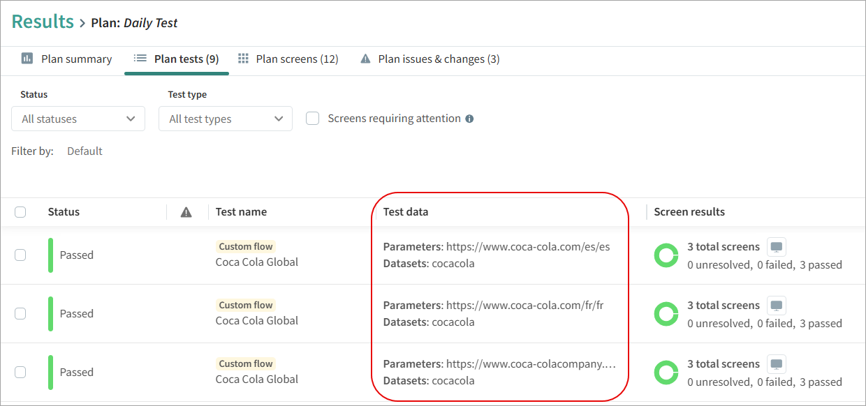 When the dataset is applied to the test, it will run multiple times, each with a different URL from the dataset. The Results page will display each test separately, with the parameter values listed in the Test Data column.