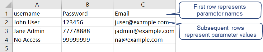 Datasets allow you to run tests with multiple sets of parameter values. A dataset is created from an XLS or CSV file where the first row contains the parameter names and subsequent rows contain different values for each parameter. A dataset file can include up to 120 parameters (columns) and 1000 values (rows), with a maximum file size of ~1 MB.