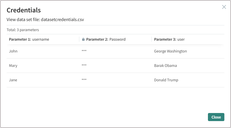 A list of values in the dataset appears. If a parameter includes confidential data, for example if the name includes "Password," "Secret," or "PIN," it is automatically masked after the plan is saved.