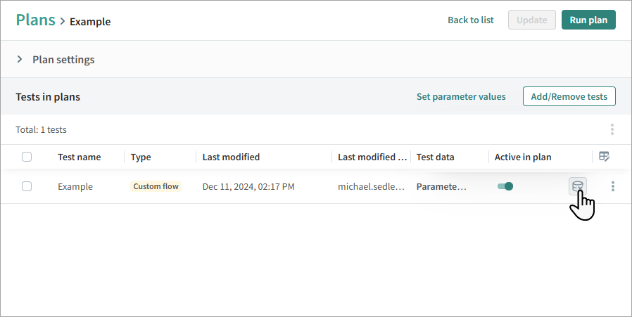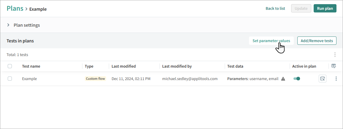 Above the list of tests, click Set parameter values. This option is available only if at least one test in the plan uses parameters.