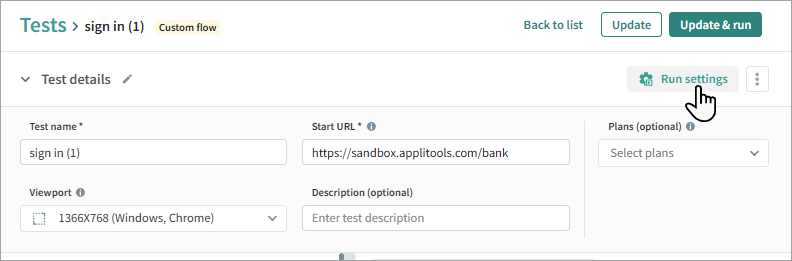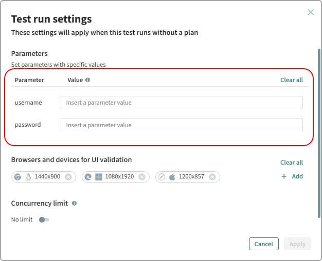When you preview or run a test without a plan, if there are parameters that do not have a value, the system prompts you to enter a value. These values are automatically saved for future test runs. You can also set or modify test parameter values in the Test run settings window.