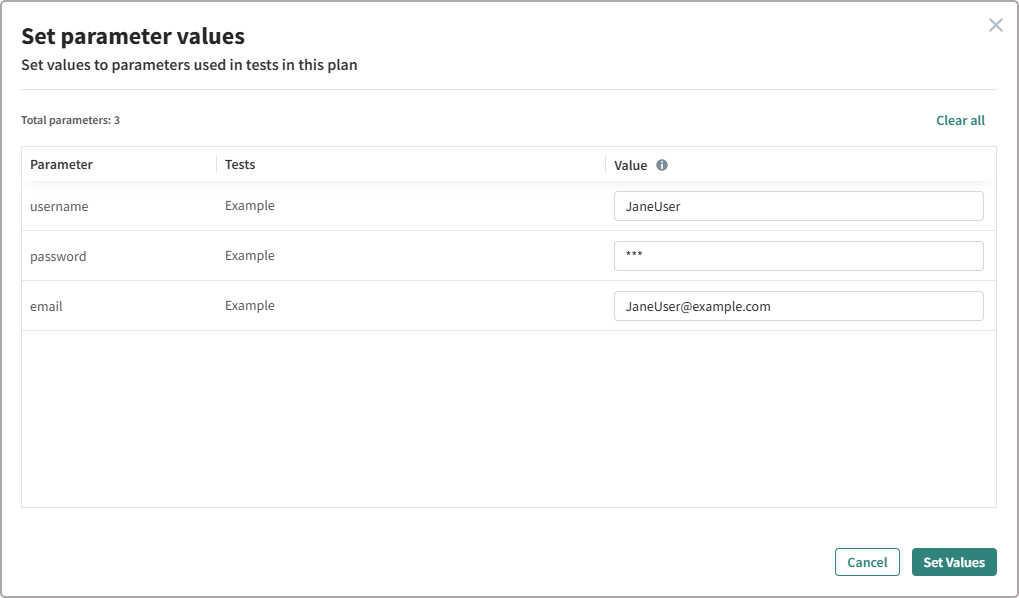 Parameters are set at the test plan level. For example, you might have a parameter for a username that is set to Jane Doe in one plan and Admin in another. When the test runs as part of each plan, it will use the parameter values assigned to that plan, allowing you to test various scenarios without modifying the test script itself. If a test in a plan has a parameter that does not have a value, the test will not run successfully and will have a status of "Aborted."