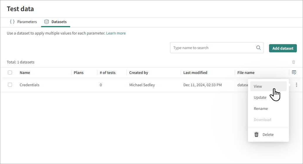 If you need to change the values in a dataset, you can download a copy of an existing dataset, make changes, and then add the revised dataset to the plan. Note that if a dataset ioncludes masked data such as passwords, you cannot download a copy of the dataset.