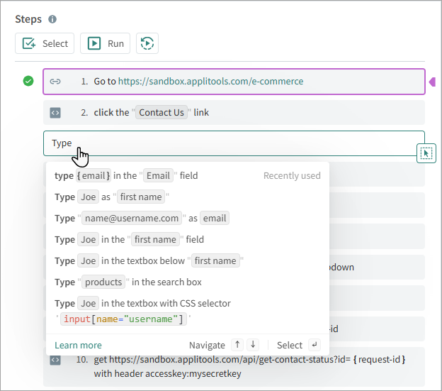 Below are examples illustrating how easy it is to create tests using Natural Language Processing. Notice how the commands are written in straightforward English, making them accessible even to those without programming or technical expertise.