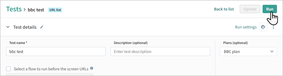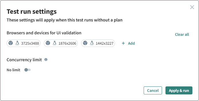 You can run a test on an ad-hoc basis without running a plan. When you run a test directly from the Test settings page, you need to select browsers and devices for the run. This is an easy way to view the results of changes you made to a test and create a baseline without waiting for the next scheduled run.