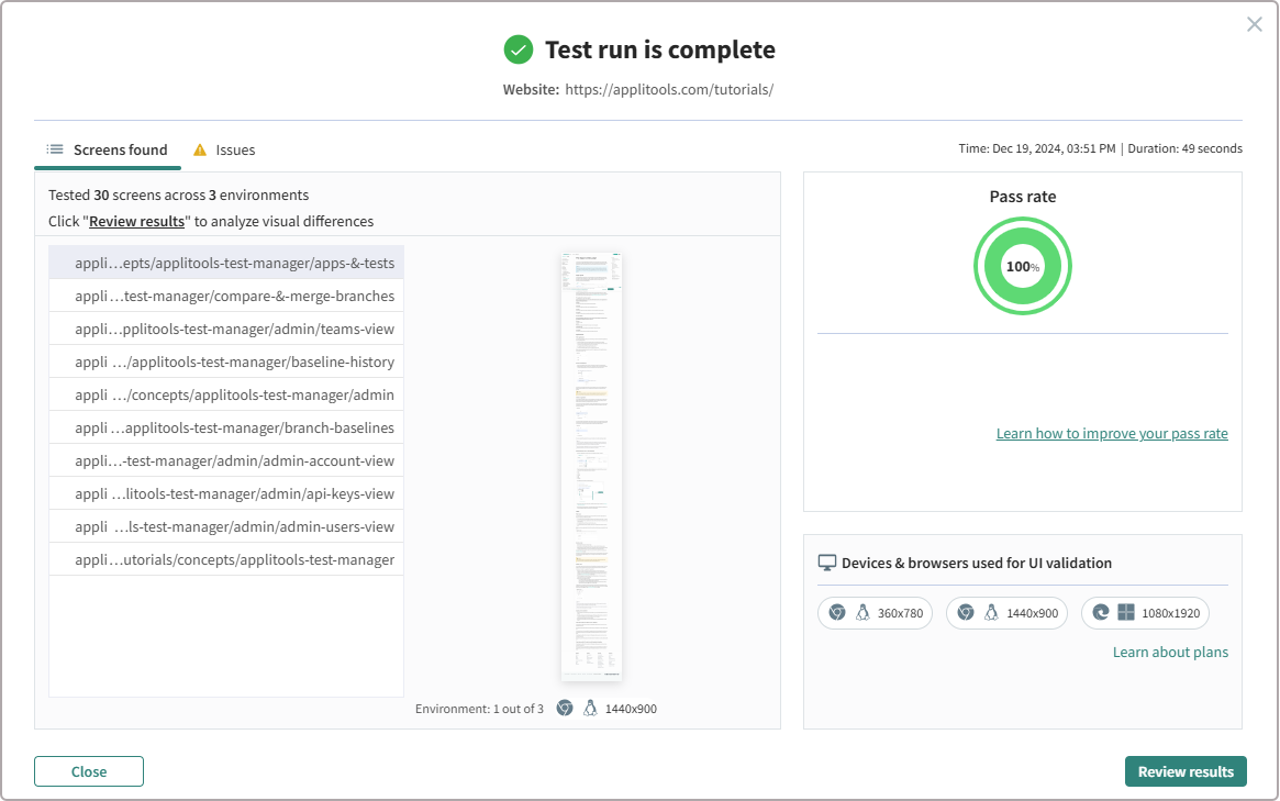Once the baselines have been generated, Autonomous displays thumbnails of the first 10 baselines in the default browser and environment.