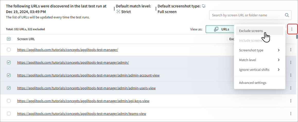 You can select URLs or folders to include or exclude from the test. For example, if your sitemap or a sub-directory contains more than the maximum number of allowed URLs, no screens will be included in the test and you need to manually select which URLs or folders should be included.