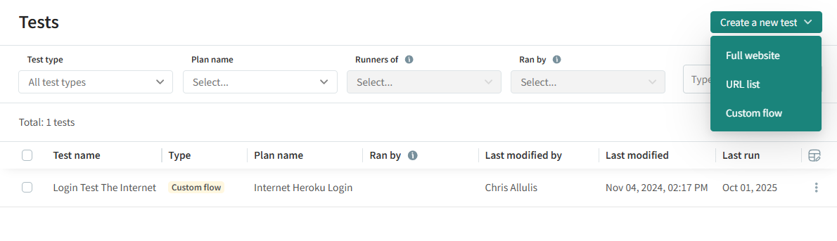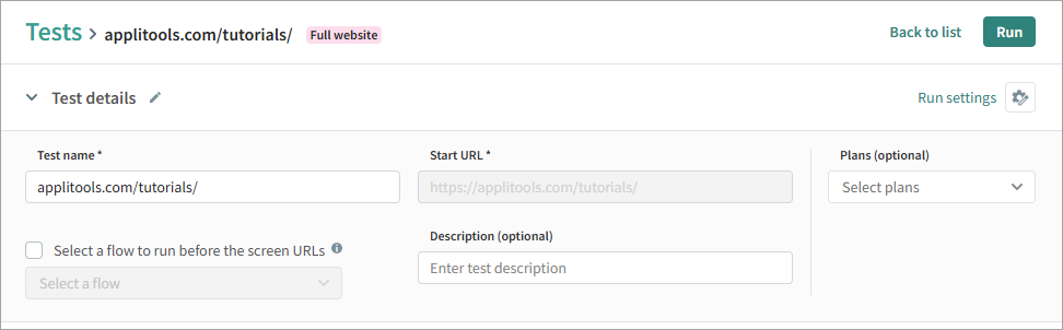 - Test name – The name of the test as it is displayed on the Tests page. By default this is the base URL of the test.