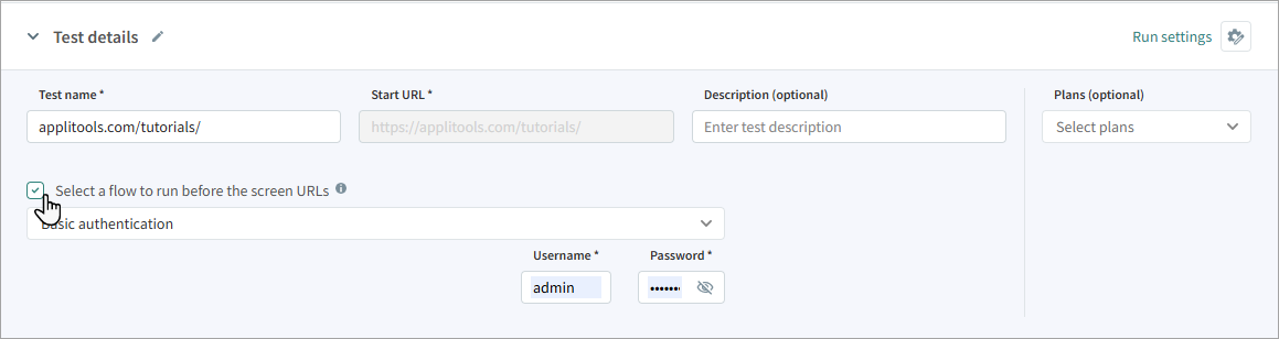 To enter basic authentication or run a custom flow before each URL opens, click Optional settings, choose Select a custom flow to run before this test, and select one of the following: