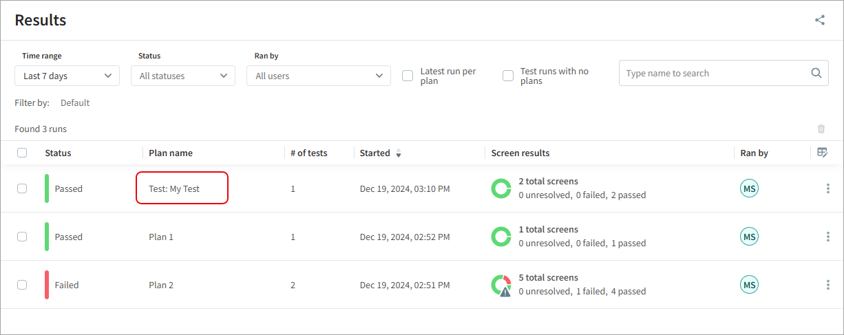 Once the test has run, you can view the status in the Results window. If the test is run without a plan, the Plan name column will list the name of the test in the Plan name column.