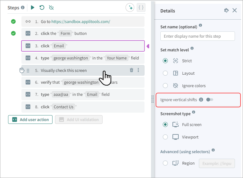 Click on a Visually check this screen step and select Ignore vertical shifts.