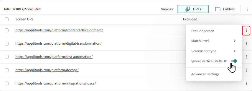 To Set Ignore Vertical Shifts in a Full Website Test or URL List Test