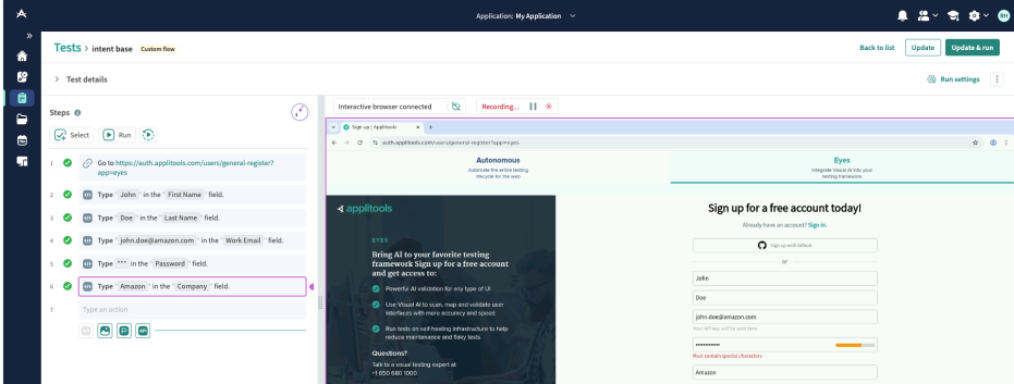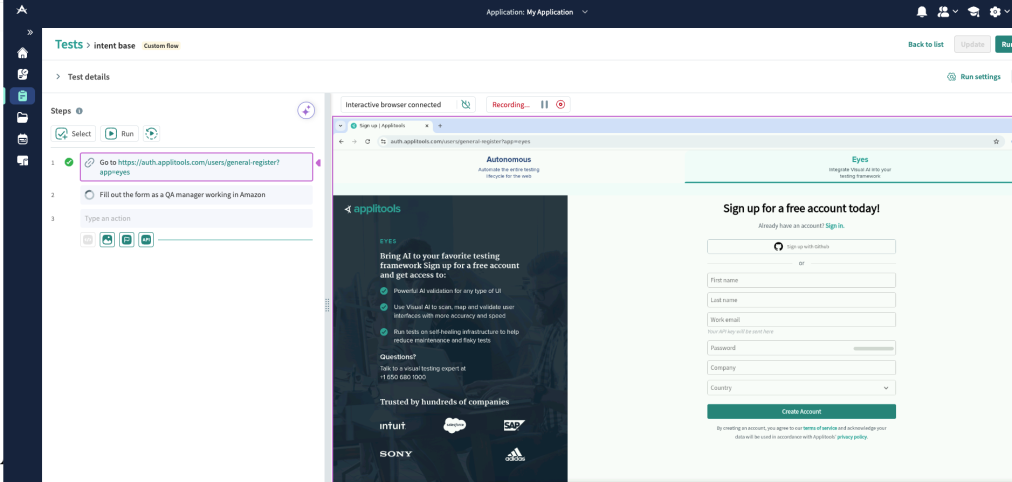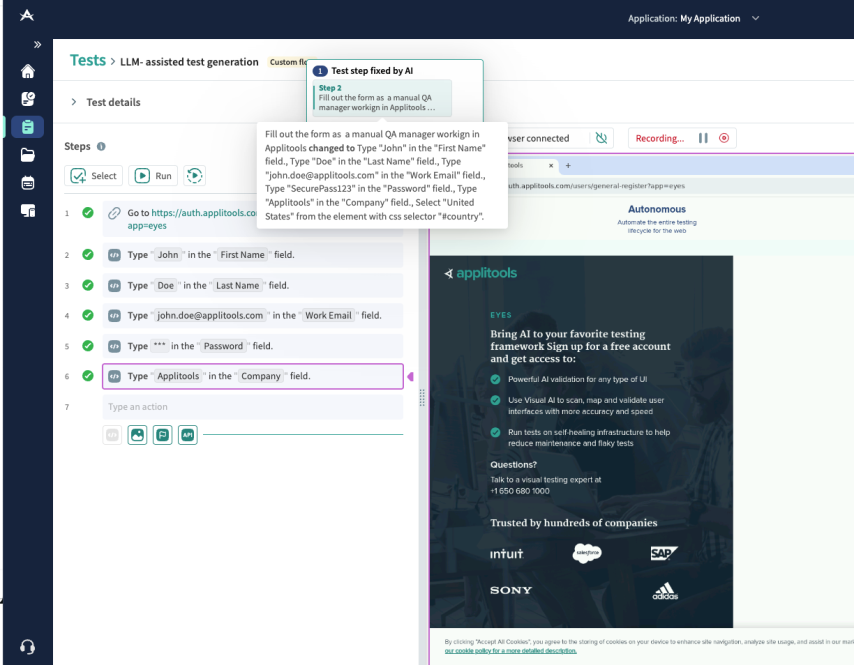 Creating thorough, reliable automated tests can be a tedious task. With LLM Generated Test Steps, you simply describe what the user needs to accomplish on the page using plain business logic, for example, “fill out the form as a QA Manager working at Applitools and submit it.”