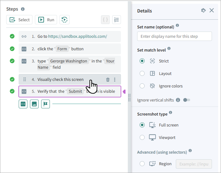 This is the default and in most situations the recommend match level. This match level verifies that the screen content matches the baseline image closely enough that the human eye would not see any difference. With this level, Autonomous detects changes in text, font, color, graphics, and position of elements. It detects differences that are visible to the human eye while ignoring differences in pixel values that are platform dependent due to the rendering software and hardware.
