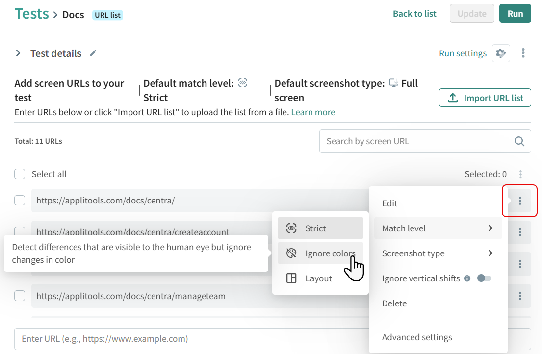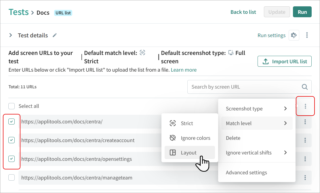 To Set the Match Level for Multiple URLs in a Full Website Test or URL List Test