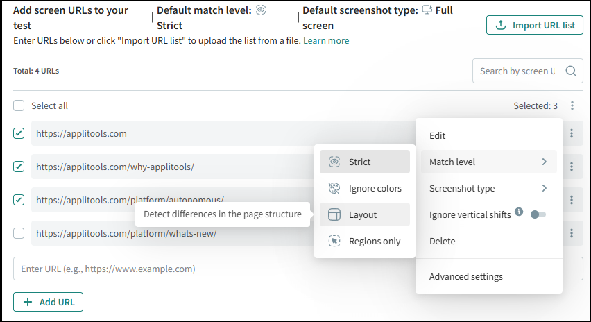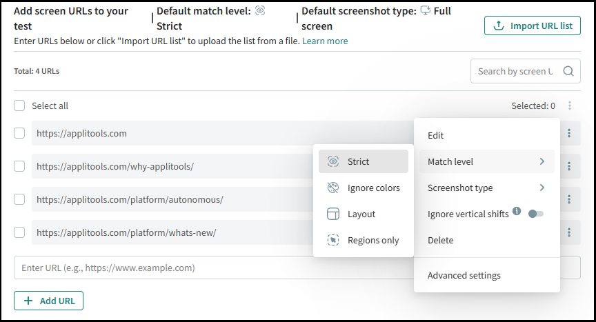 How To Set the Match Level for Multiple URLs in a URL List Test