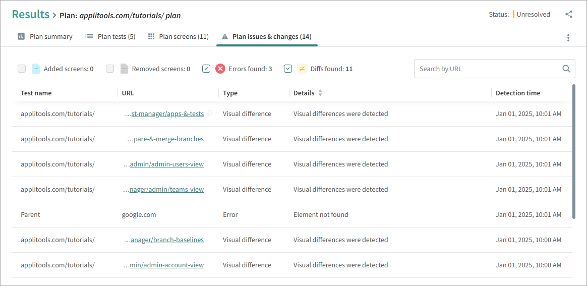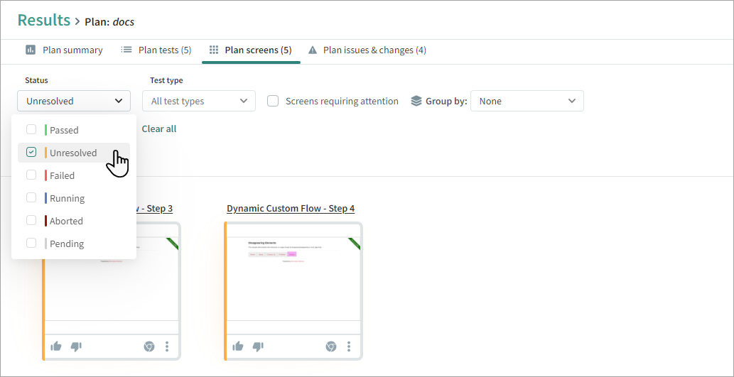 Unresolved screens are screens that had a difference which needs to be reviewed. In the Screens view, filter by Status and select Unresolved.