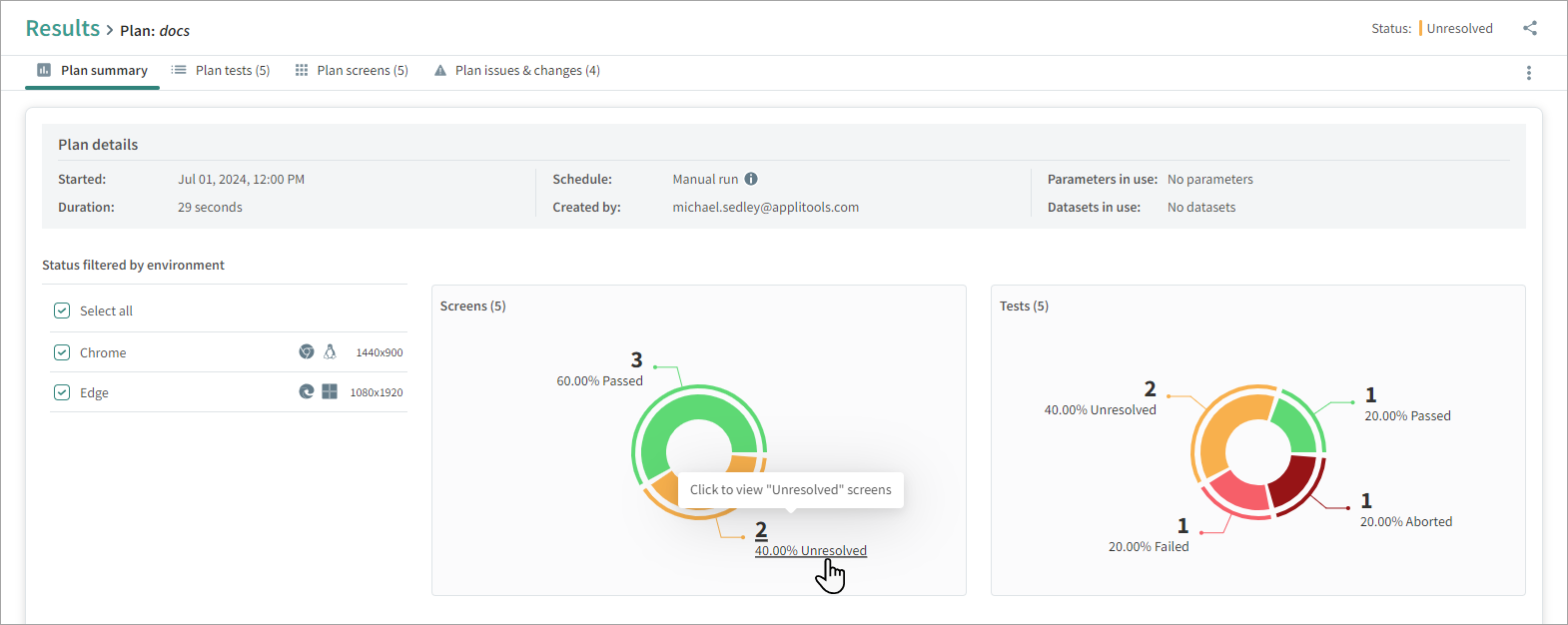 The Plan Summary offers a detailed overview of the plan run, including its execution time and the percentage of screens and tests that passed.