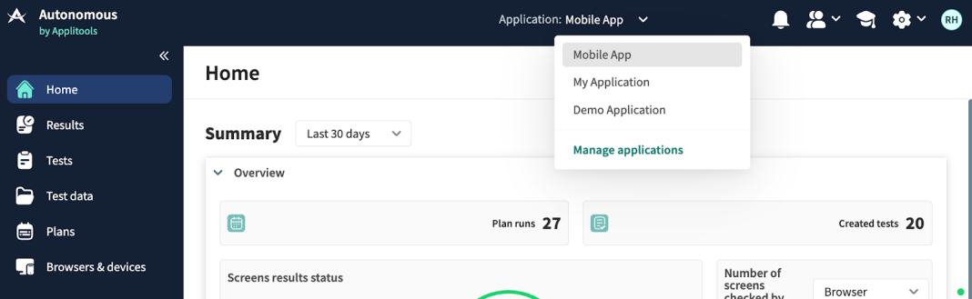 When you view other pages, such as the Home, Results, Tests, or Plans page, the displayed data is related only to the selected application. The Browsers & Devices page is global and not limited to a single application.