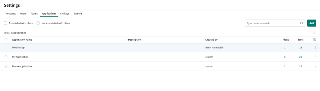 To view all applications or rename or create new ones, click Manage applications. This window displays the number of plans and tests in each application.