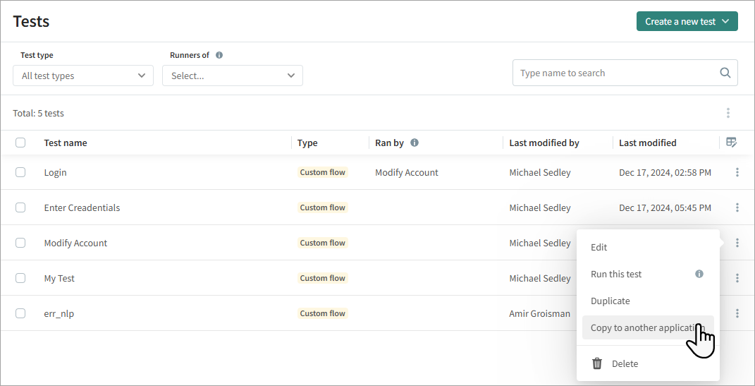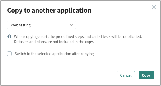 You can copy a test from one application to another, including its predefined steps and called tests. Datasets, plans, previous test results, and baselines are not copied. The copied test is independent of the original, meaning changes to one do not affect the other.