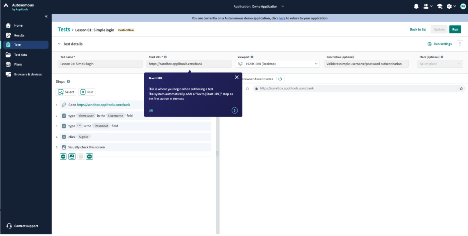 The Demo Application is a pre-configured sample application that appears in your application list and serves as a sandbox for onboarding. It showcases platform capabilities through a collection of test examples and interactive step-by-step walkthroughs.