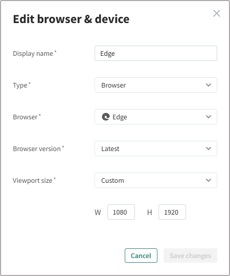 Browser – Select the browser and viewport size. For a new item, select a viewport size from the list or select Custom and enter the required size.