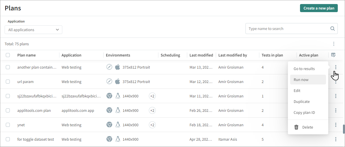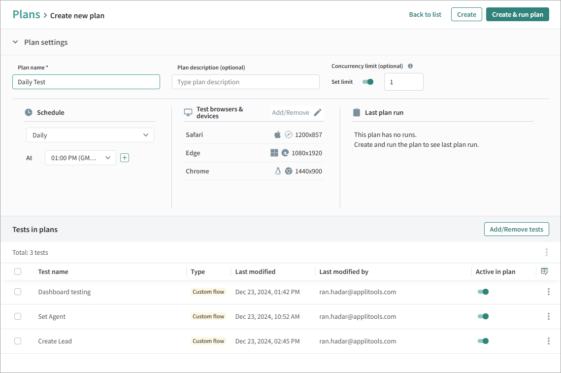 A plan allows you to run one or more test together using the same schedule and browsers & devices. Every plan is associated with an application.