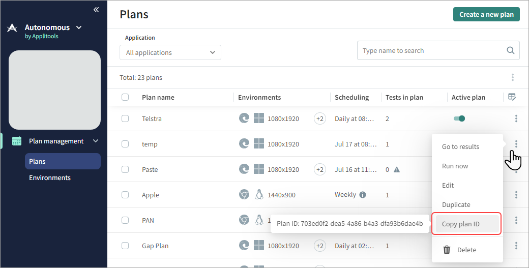 - The Plan ID. To obtain the Plan ID, from the Plans page, next to a
