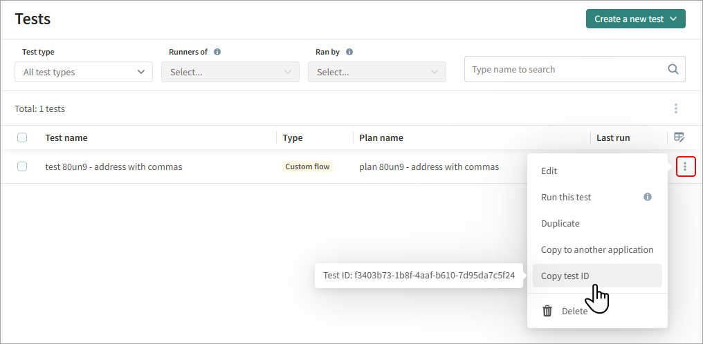 - The Test ID. To obtain the Tests ID, from the Tests page, next to a