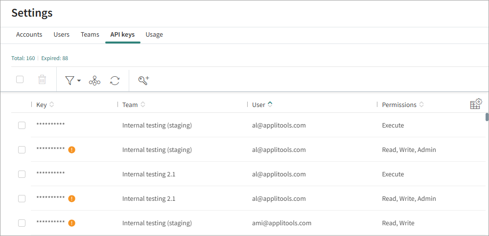 All users have a personal API key that has execute permissions. For details, see REST APIs. Administrators can modify the permissions of personal API keys or generate additional API keys and assign them to teams or users.