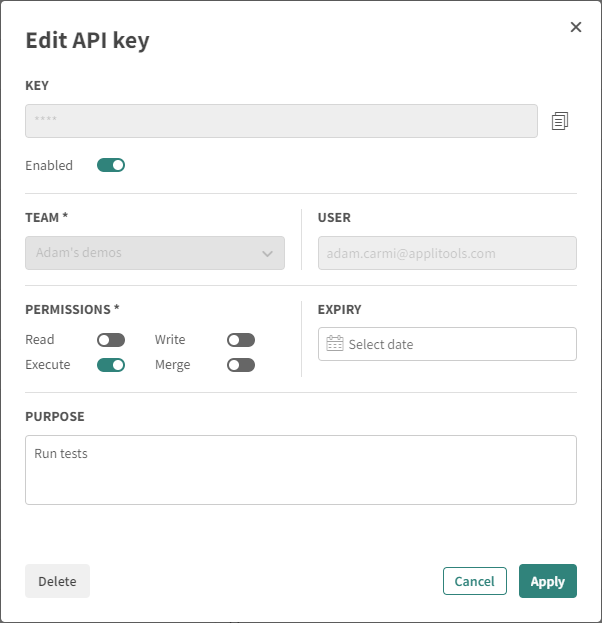 - Expires at – The expiration date of the API key. If this field is left blank, the key does not expire.