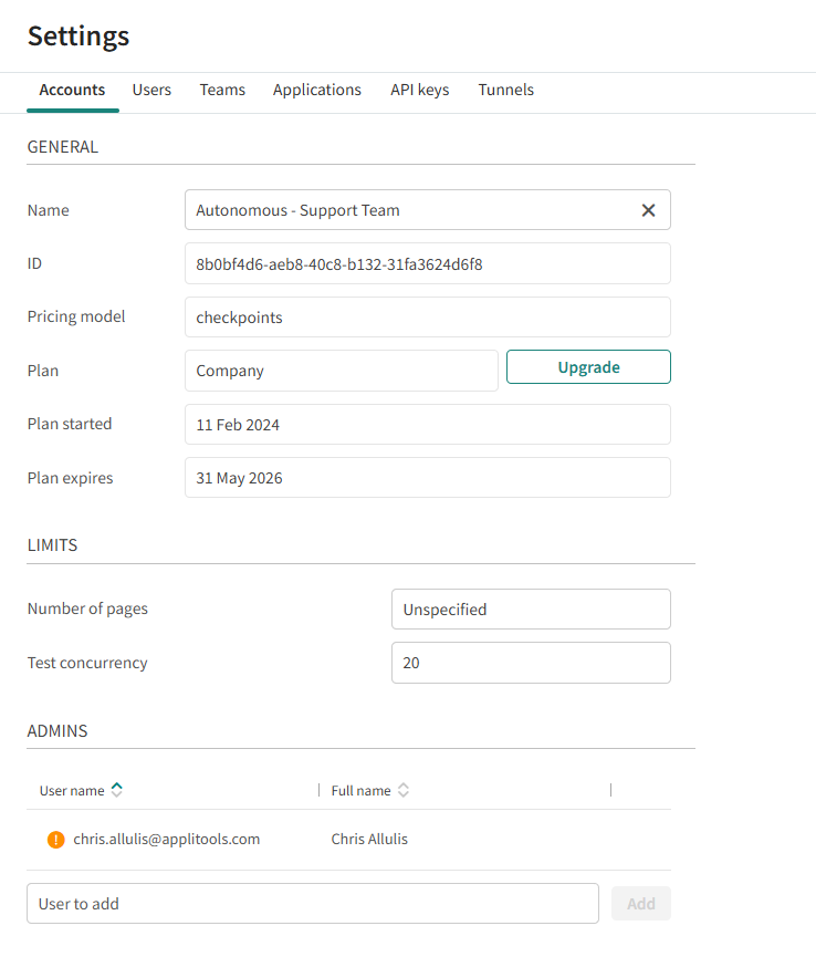 In the field at the bottom of the list of administrators, enter the email address of an Autonomous user and click Add.