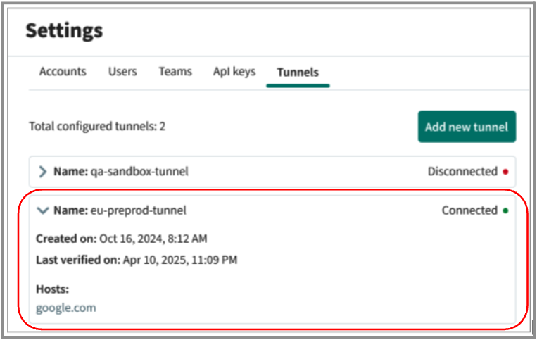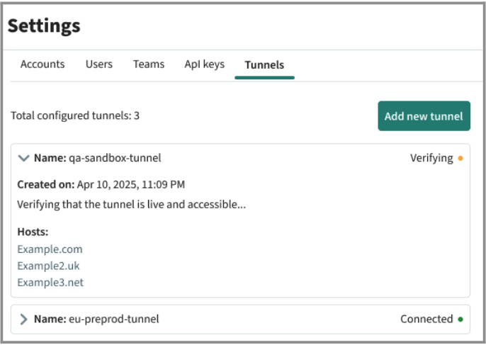 - Tunnels Tab (Admins): Lists all tunnels configured for the account, including their status,target hosts, troubleshooting, and error codes. Team Admins cannot configure or manage tunnels but can monitor their state.