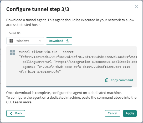 The agent corresponds to the selected operating system. To run the agent, copy the command displayed in this window and run it in a command prompt.
