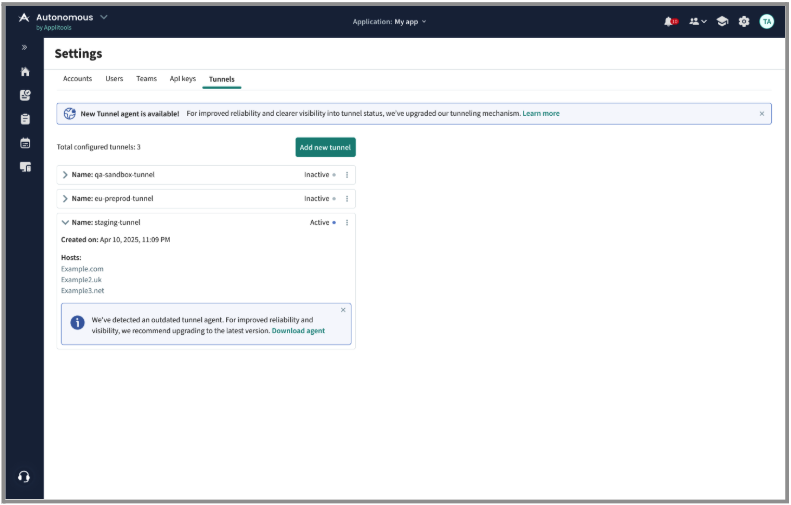 - Inactive: The tunnel agent is offline and is no longer communicating with Autonomous. This may occur if the agent is not running.