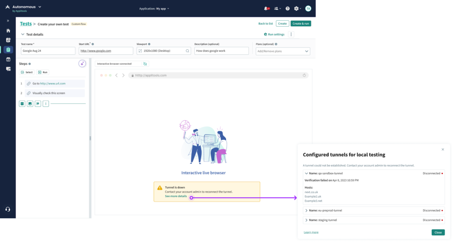 Autonomous enables testing web applications that are not publicly accessible by configuring a tunnel. A tunnel allows Autonomous to establish a secure connection for testing pre-production systems (like staging), intranet sites, or web applications behind firewalls or proxies.